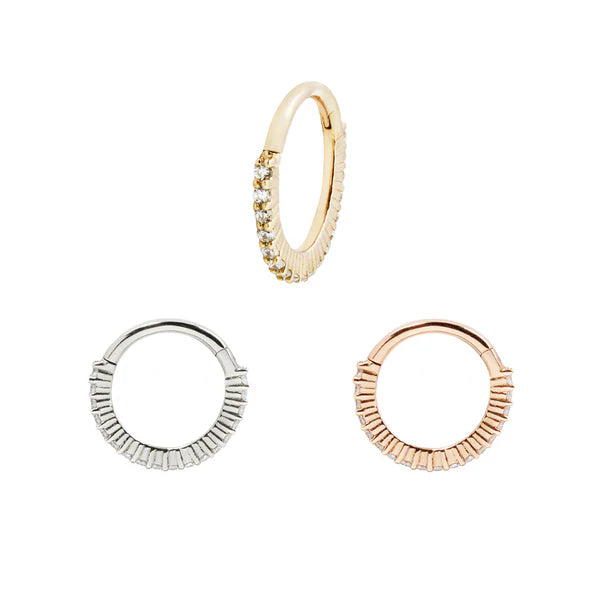 Hinged designs made for ease and security. Popular for their simple closure and comfortable fit across many piercings.